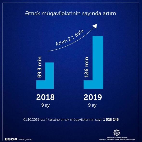 Əmək və Əhalinin Sosial Müdafiəsi Nazirliyindən verilən məlumta görə, yeni 126 min əmək müqaviləsinin 35 mini dövlət, 91 mini qeyri-dövlət sektorunda bağlanıb.