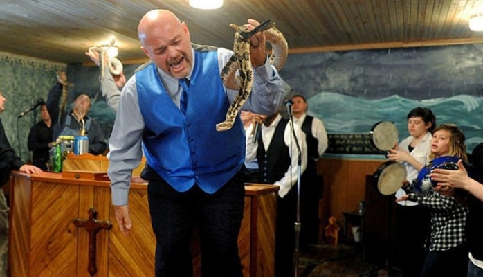 Kilsənin keşişləri kilsədə əllərində zəhərli ilan tutaraq dualar söyləyir, ibadətlər edirlər. Onları ilan dişləyəndə belə, həkim yardımından imtina edir, "Hər şey Tanrının əlindədir" söyləyirlər.
