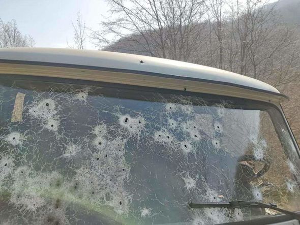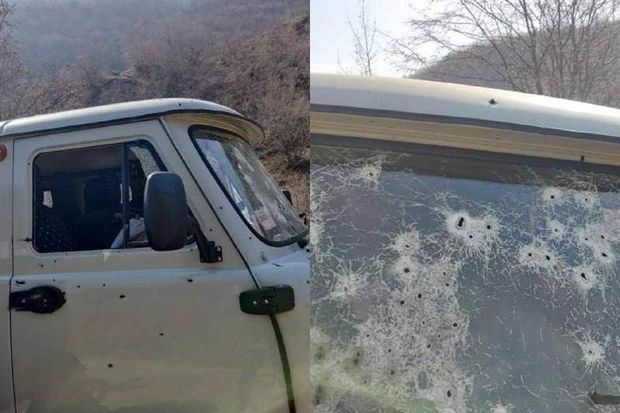 Müvafiq fotolarda UAZ markalı yük avtomobilinin atışma zamanı tamamilə yararsız hala düşdüyü əks olunub.