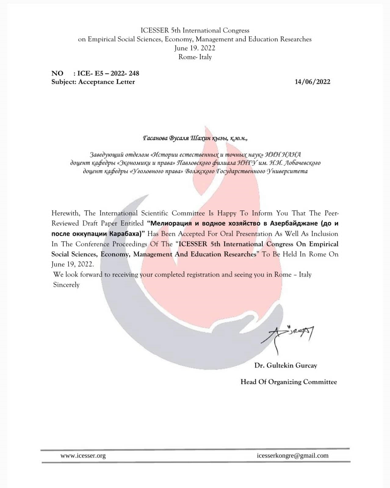Azərbaycan Milli Elmlər Akademiyasının (AMEA) Elm Tarixi İnstitutunun (ETİ) Təbiət və dəqiq elmlər şöbəsinin əməkdaşları “İSECCER” in İtaliyada kecirdiyi “Tətbiqi sosial elmlər, iqtisadiyyat, idarəetmə, və təhsil tədqiqatları” mövzusunda V Beynəlxalq elmi konfransında iştirak ediblər.