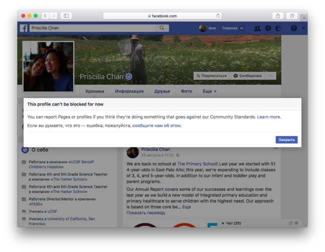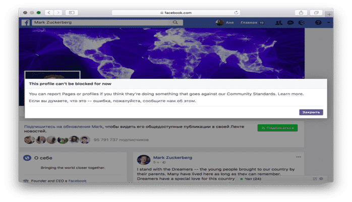 Facebook istifadəçiləri istənilən hesabı blok edə bilərlər və onun paylaşımlarını öz lentində görməyi ləğv edə bilərlər. Lakin şəbəkənin təsisçisi Mark Zukerberq və onun həyat yoldaşı Prisçilla Çanın səhifələrini blok etmək mümkün deyil. Əgər onların səhifələrini blok etməyə çalışsaq, “Bu profil blok edilə bilməz” xəbərdarlığı gələcək.
