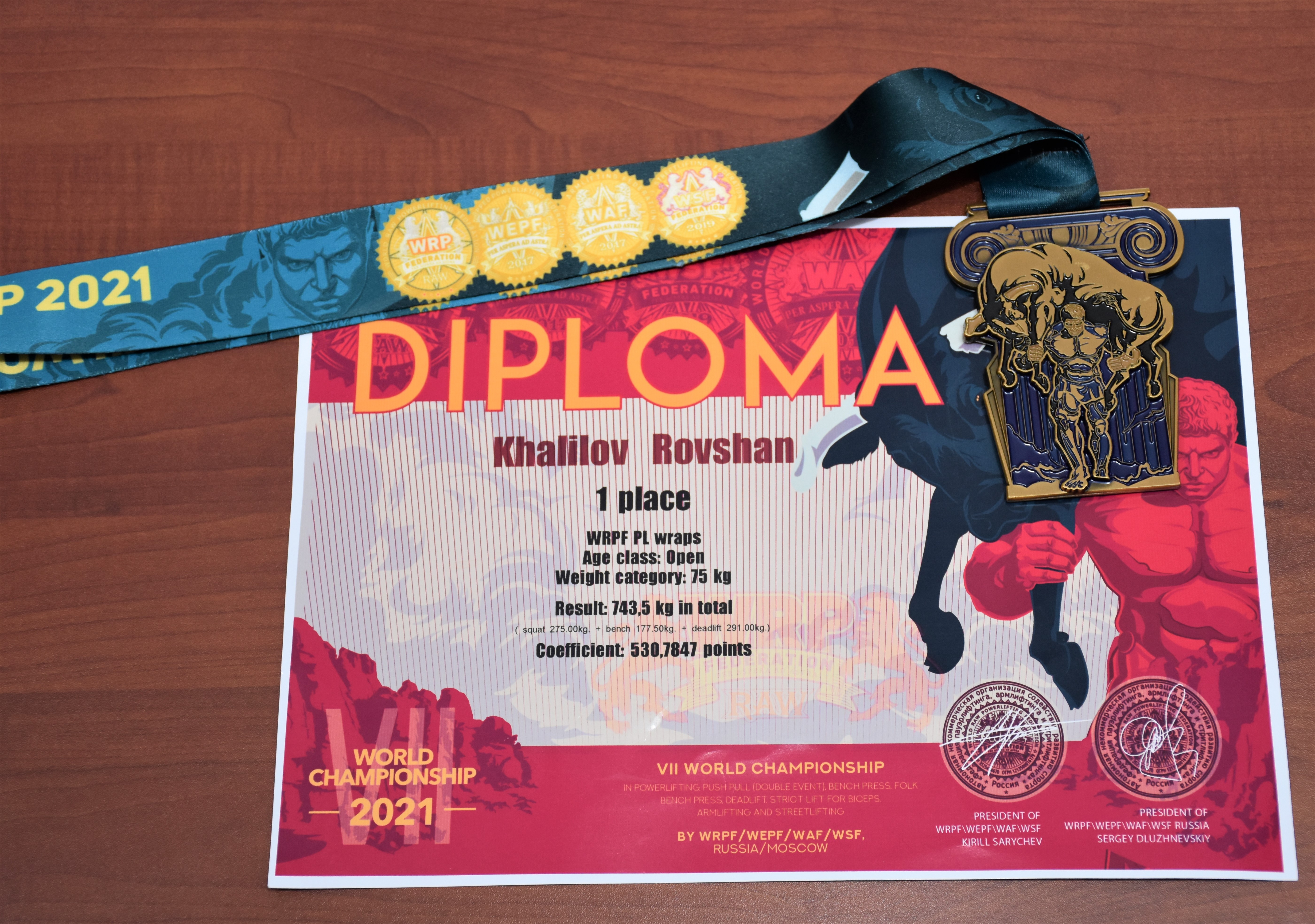 2021-ci il 16-19 dekabr tarixlərində Rusiyanın paytaxtı Moskva şəhərində Dünya Pauerliftinq Federasiyasının (WRPF) təşkilatçılığı ilə pauerliftinq idman növünün 3 növçülük üzrə (squad, benç-press və dedlift) dünya çempionatı keçirilib. Yarışda 30-dan çox ölkədən 3000-ə yaxın idmançı iştirak edib. Azərbaycan Pauerlitinq Federasiyasının təşkilatçılığı və rəhbərliyi altında Azərbaycanın pauerliftinq üzrə komandası 21 nəfərdən ibarət olmaqla çempionatda əzmkar mübarizə apararaq ümumilikdə 13 qızıl, 2 gümüş və 1 bürünc medal qazanıb.. Komandanın tərkibində iştirak edən Fövqəladə Hallar Nazirliyinin Xüsusi Riskli Xilasetmə Xidmətinin əməkdaşı Rövşən Xəlilov 75 kq çəki dərəcəsində Pauerliftinq idman növü üzrə Squad (Ağırlığı oturub qaldırmaq), Benç-press (Ağırlığı sinə üzərinə qaldırmaq) və Deadlift (Ağırlığı yerdən qaldırmaq) 3 hərəkətin cəmində 743,5 kq ağırlığı qaldıraraq, fəxri kürsünün ən yüksək pilləsinə qalxıb və qızıl medala layiq görülüb.