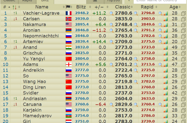 İngiltərənin paytaxtı London şəhərində davam edən "London Chess Classik" superturnirində iştirak edən fransalı qrossmeyster Maksim Vişye-Laqraf, turnirdə göstərdiyi inamlı oyunu ilə tarixi uğura imza atdı. Şahmatın blitz növü üzrə keçirilən yarışda erməni Aronyan üzərində parlaq qələbədən sonra, Maksim 2948.2 ELO xalı ilə canlı reytinqdə Maqnus Karlseni keçərək,dünyada 1-ci pilləyə yüksəldi. Qeyd edək ki, "Grand Chess Tour" çərçivəsində keçirilən London turnirində cəmi 4 şahmatçı iştirak edir (Karuana.Aronyan,Nakamura və Vişye-Laqraf).Burada şahmatçılar dairəvi sistemlə kassik,rapid və blitz partiyaları keçirilər.Turnir dekabrın 17-dək davam edəcək.