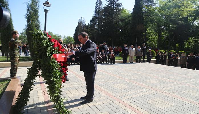 Gəncə Şəhər İcra Hakimiyyətinin başçısı Niyazi Bayramov ilk azərbaycanlı Sovet İttiafqı Qəhrəmanı İsrafil Məmmədovun məzarüstü abidəsi önünə əklil qoyub. Böyük Vətən Müharibəsində, eləcə də Azərbaycanın suverenliyi, istiqlaliyyəti, ərazi bütövlüyü uğrunda həlak olan həmvətənlərimizin əziz xatirəsi 1 dəqiqəlik sükutla yad edilib. Daha sonra Hərbi Orkestrın ifasında Azərbaycan Resublikasının Dövlət Himni səsləndirilib.