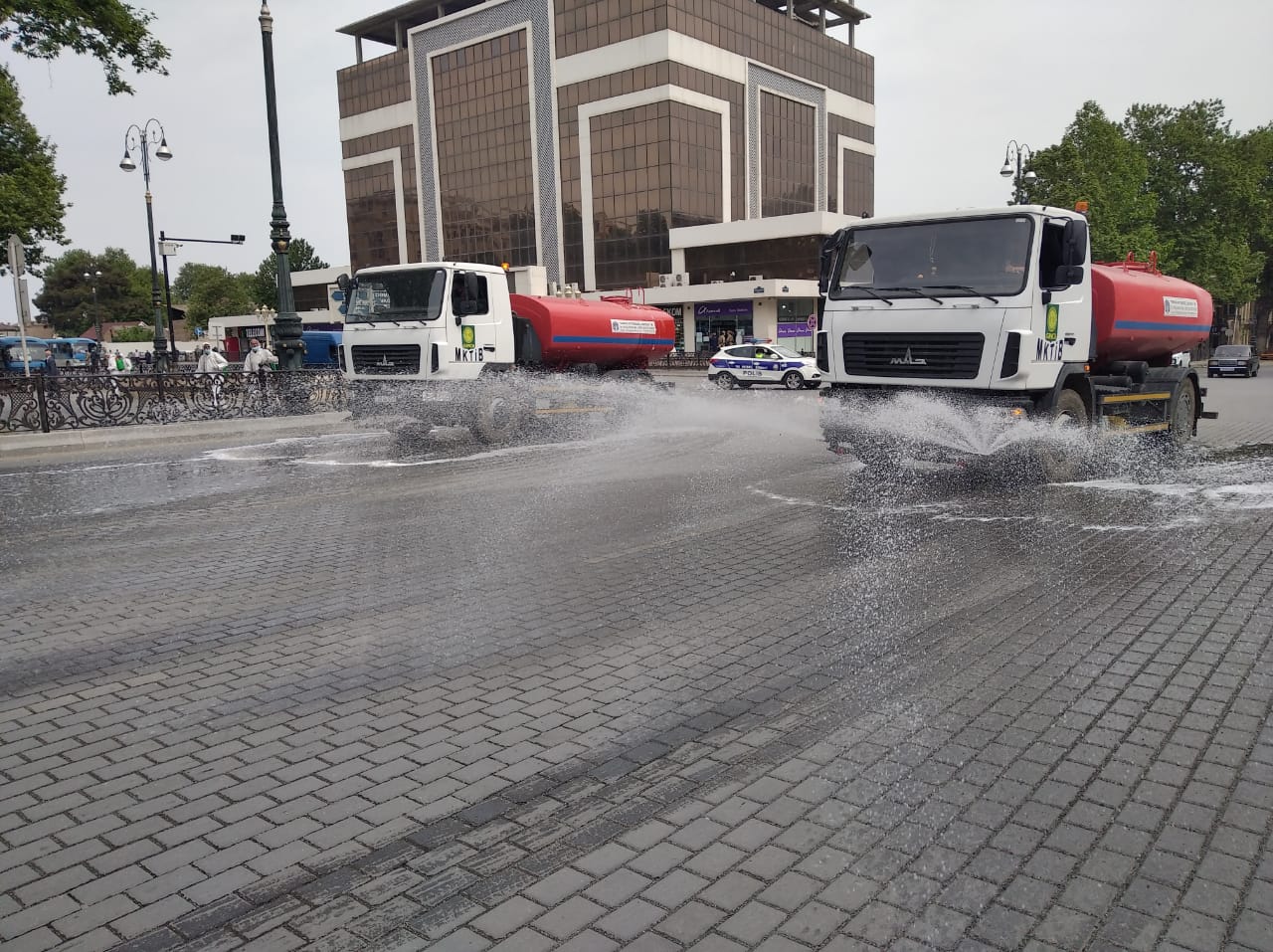 MKTİB-in xüsusi su çiləyici avtomobilləri şəhərin Heydər Əliyev, Atatürk və Nizami Gəncəvi prospektlərində, habelə ara küçələrində dezinfeksiya işləri aparırlar.