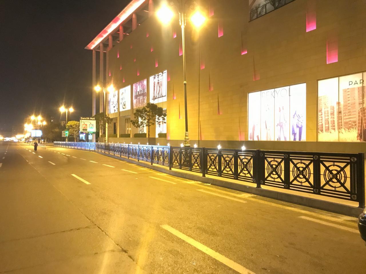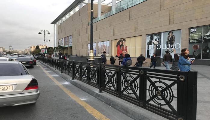 "Gənclik Mall"un qarşısındakı səkinin müəyyən hissəsi dəmir məhəccərlə əhatələnib.
