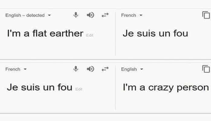 Məlum olub ki, tərcümə servisi Yer kürəsini düz hesab edən insanlara gülməyi də bacarır. Əgər ingilis dilində “I’m a flat earther” ifadəsini yazsaq, bu fransız dilində “Je suis un fou” kimi, yəni “Mən dəliyəm” kimi tərcümə olunacaq.