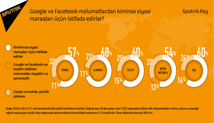 Böyük Britaniyada rəyi soruşulanların 33%-i Google və Facebook kimi şirkətlərin məlumatlardan bu və ya digər siyasi baxışın xeyrinə manipulyasiya etmək üçün xüsusi alqoritmlərdən istifadə etdiyinə dair suala cavab verməyə çətinlik çəkib. Fransada bu rəqəm 32% təşkil edib. İtaliyada 25%, ABŞ-da 24%, Almaniyada isə 21% respondent bu suala cavab verə bilməyib.