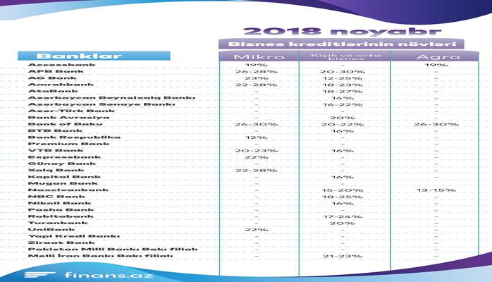 Bu ilin noyabr ayında 2 bankda biznes kreditləri üzrə faiz dərəcələrinə yenidən baxılıb. Belə ki, "BTB Bank"da kiçik və orta biznes üzrə dərəcələr 19%-dən 16%-ə, "Nikoil Bank"da biznes kredtiləri üzrə faiz dərəcələrinin minimum həddi 20%-dən 16%-ə salınıb.