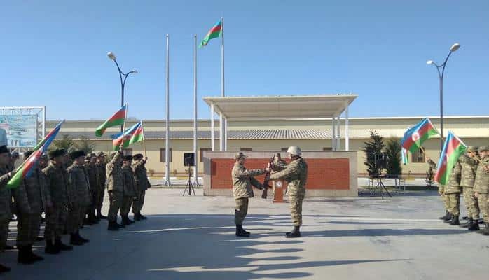 Sonra xidmət müddəti başa çatmış hərbi qulluqçular döyüş növbətçiliyini qəbul edən gənc əsgər yoldaşlarına rəmzi olaraq silah, zirehli jilet və dəbilqələri təqdim ediblər. Gənc əsgərlər uğurla, Vətənə şərəflə xidmət edəcəklərinə, torpaqlarımızın keşiyində ayıq-sayıq dayanacaqlarına söz veriblər.