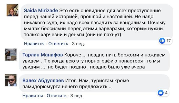 "Bu, keşmiş və indiki tariximizə qarşı hamımıza aydın olan bir cinayətdir. Heç bir məhkəmə lazım deyil, bu şəxsləri vandalizmə görə həbs etmək lazımdır" - sosial şəbəkə istifadəçisi Səidə belə yazıb.