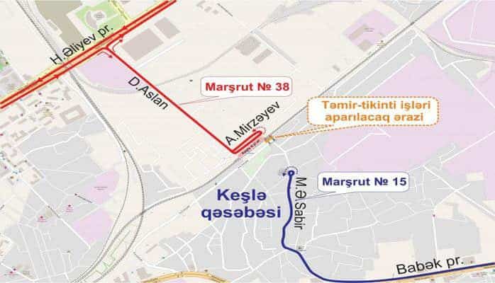 Nizami rayonu Keşlə qəsəbəsi Mirzə Ələkbər Sabir və Abdulla Mirzəyev küçələrinin kəsişməsində dəmir yol keçidində müxtəlif səviyyəli yol ötürücüsünün (tunel) inşası ilə əlaqədar nəqliyyat vasitələrinin hərəkəti 18 aprel 2019-cu il gecə saat 00:00-dan etibarən tam məhdudlaşdırılacaq. Bu səbəbdən, qeyd edilən ərazidən keçən 38 və 15 nömrəli müntəzəm marşrut xətti üzrə avtobusların hərəkət sxemində dəyişiklik edilib. Dəyişikliyə əsasən, 38 nömrəli müntəzəm marşrut xətti üzrə avtobusların son dayanacaq məntəqəsi A.Mirzəyev küçəsinə keçirilib. 15 nömrəli müntəzəm marşrut xətti üzrə avtobuslar isə Mirzə Ələkbər Sabir küçəsi ilə Puşkin küçəsinin kəsişməsindən geri dönərək müəyyən olunmuş sxem üzrə hərəkət edəcəklər.