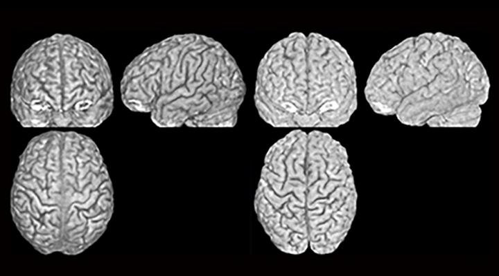 İki əkizin beyninin müxtəlif rakurslardan skan edilmiş şəkilləri. Hər ikisinin anatomiyasının detalları bir-birindən fərqlənir.