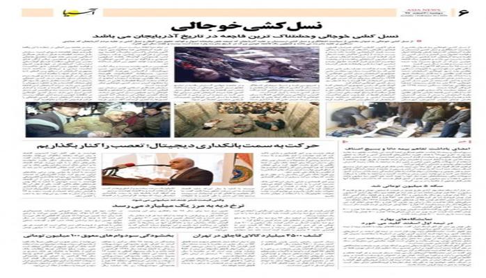 İranda nəşr olunan nüfuzlu “Asiya” qəzetinin 25 fevral tarixli sayında “Xocalı soyqırımı” sərlövhəli məqalə dərc olunub.