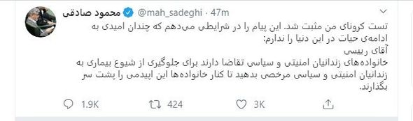 “Korona testim müsbət çıxdı. Bu mesajı dünyada yaşamağa ümidimin azaldığı vəziyyətdə yazıram”, - deyə bildirən tehranlı millət vəkili müvafiq qurumları koronavirusla mübarizəyə səsləyib.