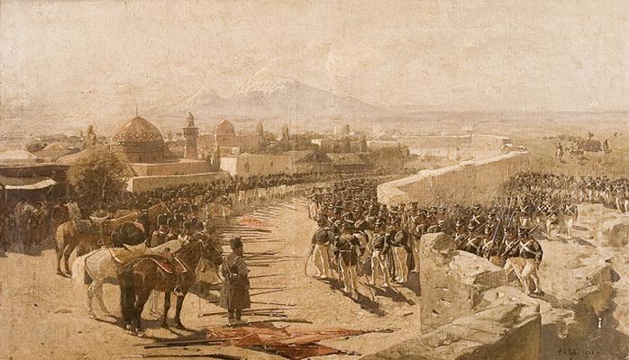 İş burasındadır ki, indiki Yerevan Şərqdə islam memarlığının mirvarisi kimi qürur duyan gözəl İrəvan qalasının qalıqları üzərində tikilib. Yerevanın müsəlman və türk keçmişinin sübutu isə rus rəssamı Frans Rubonun “1827-ci il 1 oktyabr tarixində İrəvanın qalasının təslimi” adlı rəsm əsəri hesab olunur ki, burada İrəvan qalası, onun məscidlərinin qübbələri, minarələr, xan sarayı və şərq müsəlman geyimində sakinləri əks olunub.