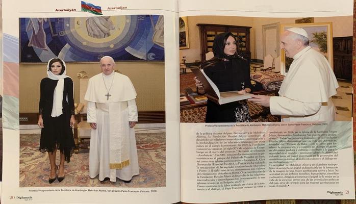 İspaniyanın nüfuzlu “Diplomatiya XXI əsr” jurnalında Azərbaycan Respublikasının Birinci vitse-prezidenti, Heydər Əliyev Fondunun prezidenti Mehriban Əliyevanın çoxşaxəli fəaliyyətindən, o cümlədən tolerantlıq və mədəniyyətlərarası dialoqun inkişafı sahəsində əvəzolunmaz xidmətlərindən bəhs edən geniş məqalə dərc olunub.