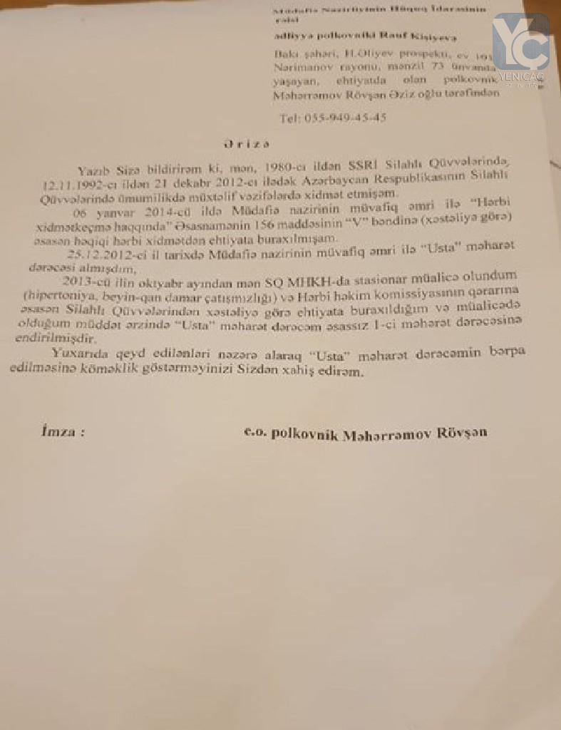 Üzləşdiyi vəziyyətlə bağlı ölkə rəhbərliyinə müraciət hazırlayan ehtiyatda olan polkovnik Rövşən Məhərrəmov ona qarşı edilən qanunsuzluqların aradan qaldırılmasını xahiş edir: