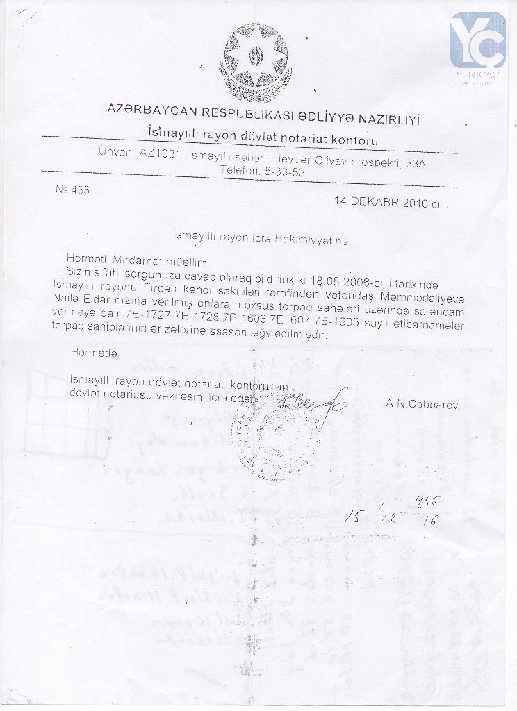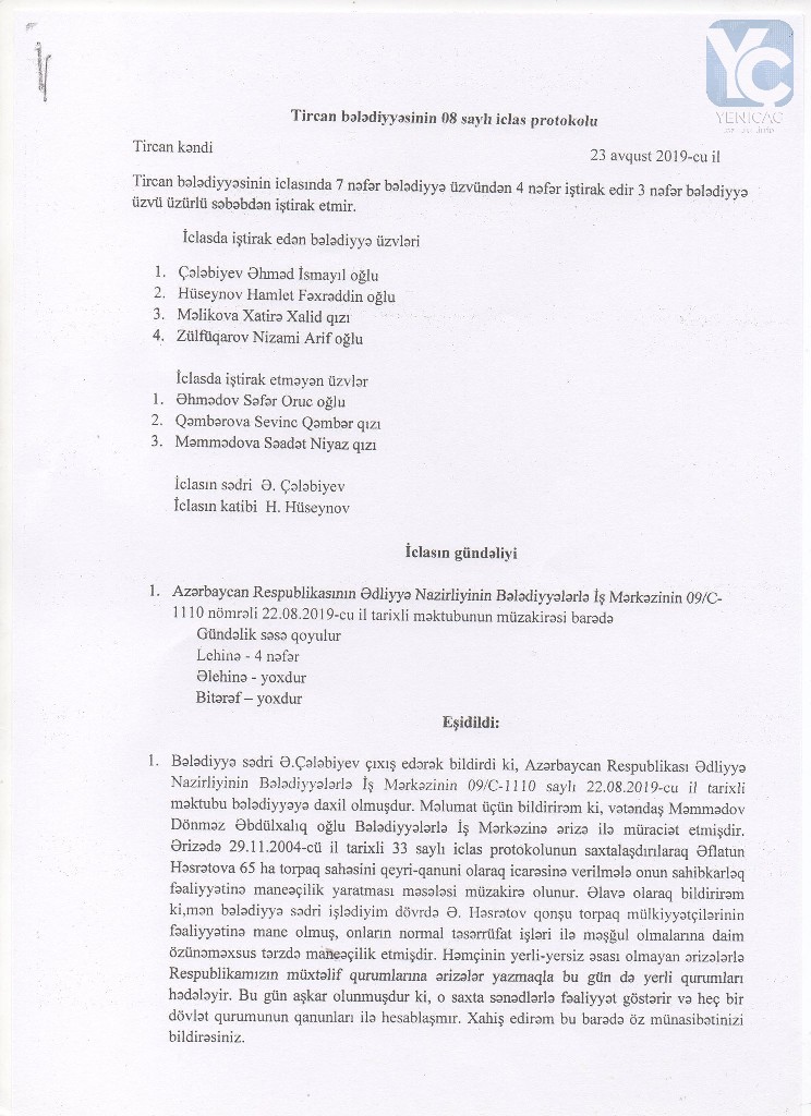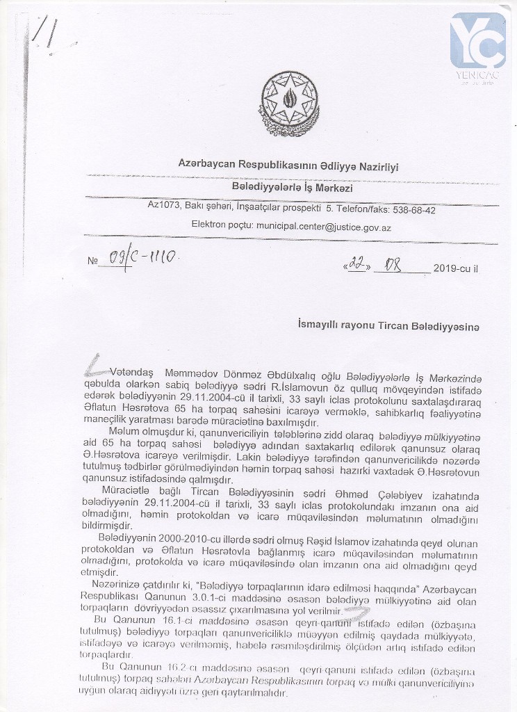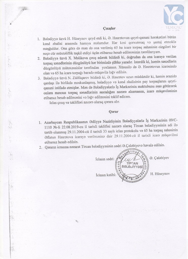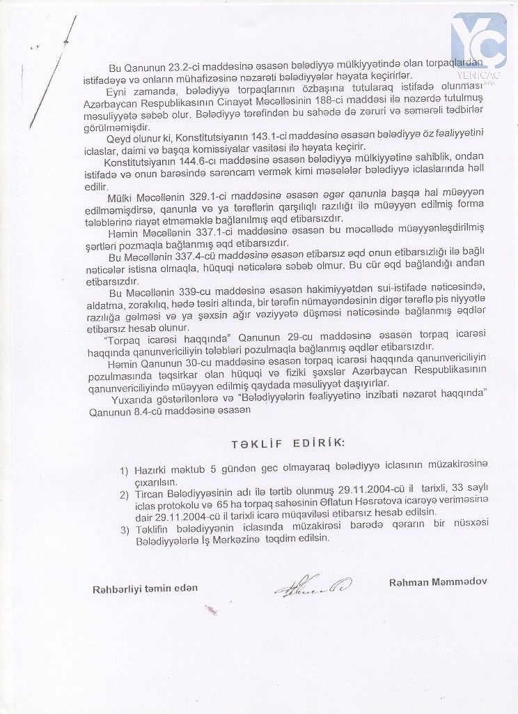 “Şüşəli bazar”ın arxasında ləğv edilmiş hərbi hissənin ərazisindəki yeri vəzifədən sui-istifadə edərək bazar qiymətindən dəfələrlə ucuz qiymətə özəlləşdirdilər və orada villa tikdirdilər. Necə ola bilər ki, o ərazi zəbt olunur, orada villa tikilir, ancaq zabitlərin çoxu evsiz, eşiksiz qalıb? Deyirlər ki, o ərazini prezident İlham Əliyev onlara verib. Prezident İlham Əliyev deməyib ki, gedin adama hektar yarım yer zəbt edin… Hansı ki, oranın bazar qiyməti 350-400 min manatdır. O 3 hektar yer satılısa idi, yüzlərlə zabiti evlə təmin etmək olardı. Necə ola bilər ki, həmin ərazidəki 3 mərtəbəli köhnə kazarma “qəzalı vəziyyətdədir” deyərək, özəlləşdirlib, daha sonra isə əsaslı təmir edilərək, özlərinə yaxın zabitlərə verilib? Evsiz-eşiksiz zabitlər qalıblar kənarda, ancaq özlərinin qohumlarına, tanışlarına ev paylayırlar. Niyə görə belə olmalıdır”?