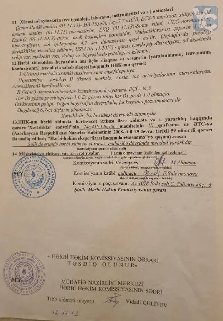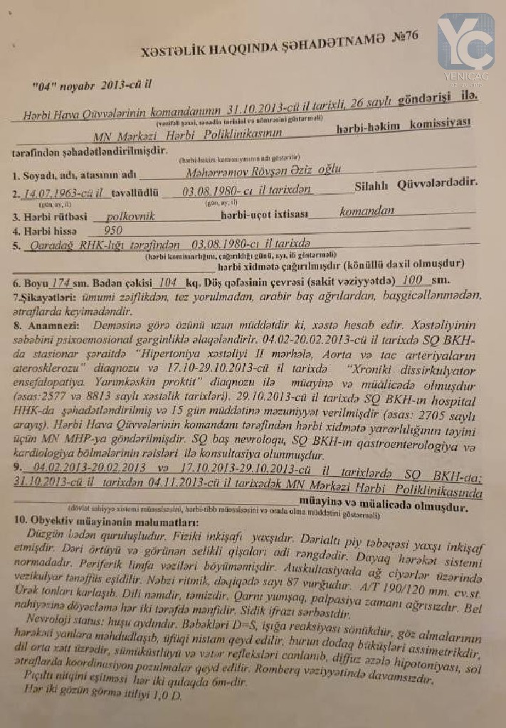 “Sizə təqdim etdiyim arayşda da görürsünz ki, xəstəliyimlə əlaqədar ordu sıralarından tərxis edilmişəm. Hərbi Hava Qüvvələrində xidmət edən vaxt səhhətimdəki problemlərlə əlaqədar xəstəxanada müalicə olunurdum. Hərbi Hava Qüvvələrinin rəhbərliyi ötənilki ustalıq dərəcəmi təsdiq etmək üçün Müdafə Nazirliyinə göndərmişdi. Ancaq mənə məlum olmayan səbəbdən, dərəcəmi təsdiq etməmişdilər. Onun əvəzində mənə birinci dərəcə vermişdilər. Bu isə mənim üçün maliyyə itkisi deməkdir.