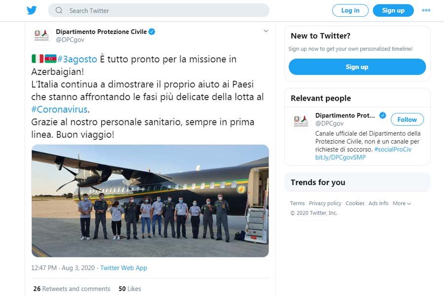 İtaliya Mülki Müdafiə Departamenti koronavirus pandemiyası ilə mübarizə çərçivəsundə Azərbaycana tibbi missiya göndərir.
