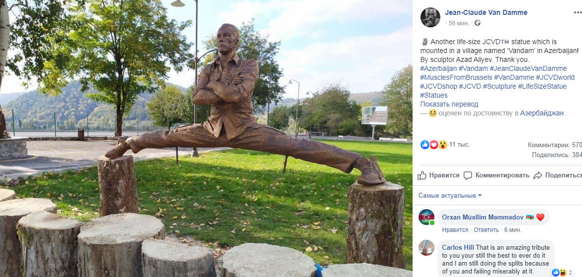 Məşhur belçikalı aktyor və idmançı, Hollivud ulduzu Jan-Klod van Damm Qəbələ rayonunda ona qoyulan heykəli öz "Facebook" səhifəsində paylaşıb.