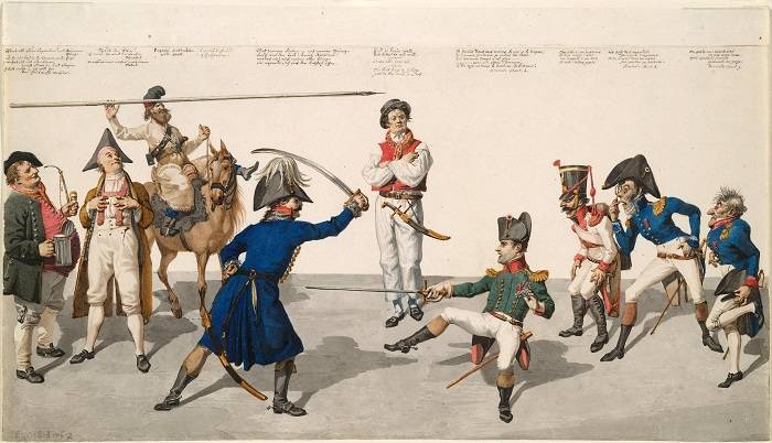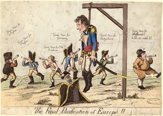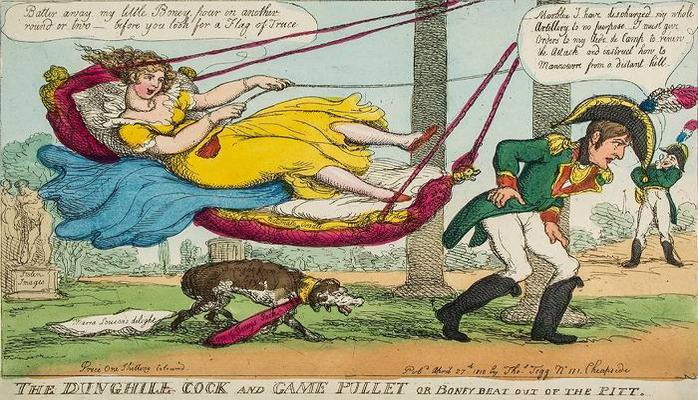 İdeoloji karikaturanın ən yaxşı örnəyi hesab olunan “The plumb pudding in danger” karikaturası isə buna qədər İngiltərədə şöhrət qazanmışdı. Ceyms Gillarinin məşhur karikaturasında Napoleonla Uilyam Pitt dünyanı süfrədə çəngəl-bıçaqla bölməyə çalışırdılar. Bu karikaturadakı öldürücü tənqid həmin illərdə bütün dünyada məşhur olmağa başlayır. Napoleonla bağlı ən dəhşətli karikatura isə Londonda gənc karikaturaçı Filips tərəfindən çəkilən “Müasir qəhrəmanın səyahəti” əsəri hesab oluna bilər. Napoleonun Elba adasına sürgün olunmasını göstərən karikaturada eşşəyə tərs oturmuş və qılıncı qırılan bir məğlub görünürdü.
