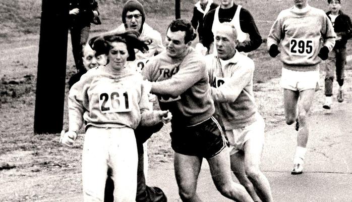 Kameralar qarşısında bir anda yola çıxan Jack Semple, Kathrinenin qolundan tutaraq “Rədd ol yarışdan və cəld nömrəni ver.” dedi. Kobudcasına qadın atleti yarışdan uzaqlaşdırdı. Kathrine qorxsa da qaçmağa davam etdi. Sonra heç bir marafon təcrübəsi olmayan ancaq Kathrini tək qoymaq istəməyən sevgilisi, 390 nömrəli Thomas Miller, Jack Semplei uzaqlaşdırdı və bütün bunlar media önündə baş verdi. Beləliklə, illər boyu yaddaşlardan silinməyəcək şəkillər ortaya çıxdı.