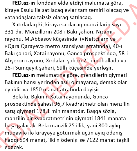 İpoteka və Kredit Zəmanət Fondu (İKZF) tərəfindən kirayə üsulu ilə satılacaq mənzillərin qiymətləri də məlum olub.