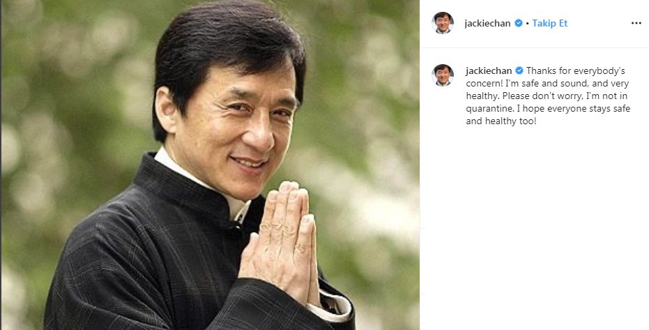 Teleqraf.com xəbər verir ki, Ceki Çan həyat yoldaşı və qaynanası ilə karantinə yerləşdirilməsi haqqında yayılan məlumatları rədd edib.