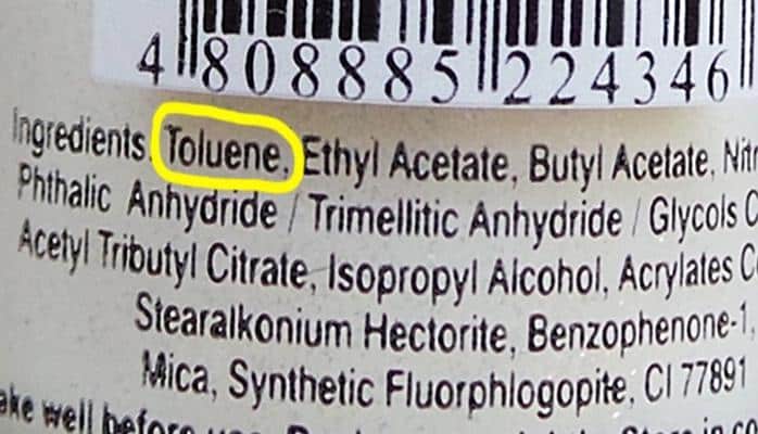 Toluol (Toluene) - həlledici maddədir, onun sayəsində dırnaqlarda hamar örtüyü yaradılır və piqment saxlanılır. Araşdırmalarda məlum olub ki, toluol mərkəzi sinir sisteminə təsir göstərə və reproduktiv funksiyasının pozulmasına səbəb ola bilər. Keyfiyyətsiz laklardan çox istifadə baş ağrıları, ürəkbulanma, zəiflik, ürəkkeçmələrə səbəb ola bilər.