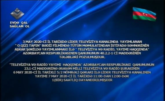 Qeyd olunub ki, 2020-ci ilin mayın 3-də “Lider” televiziyasının efirində yayımlanan “O qızı tapın” bədii filmində tütün məmulatından istifadə səhnəsinin aşkar şəkildə yayımlanması ilə “Televiziya və radio yayımı haqqında” Azərbaycan Respublikasının Qanununun 35.10-cu maddəsinin tələbləri pozulub.