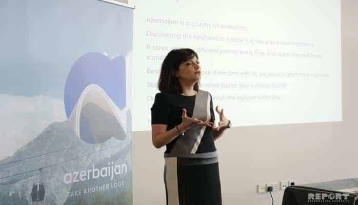 Daha sonra Büronun brend və marketinq üzrə direktoru Fidan Əliyeva Azərbaycanın yeni turizm brendi və loqosunu təqdim edib. O, Azərbaycan mədəniyyətindən və tarixindən bəhs edərək bildirib ki, ölkə bir çox imkanlara malikdir: “Mədəniyyətimiz, insanlarımız, tarixi gözəlliklərimiz insanları hər zaman özünə çəkir. Biz yeni brendi yaradarkən məqsədimiz Azərbaycanın daha bir gözəlliyini üzə çıxarmaqdır”.