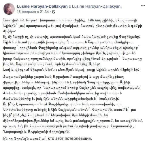 Oxu.Az xəbər verir ki, Paşinyanın məğlubiyyəti barədə ən hərarətli çıxış edənlərdən biri “Facebook” hesabı vasitəsilə məsələyə münasibət bildirən “Ümumerməni Milli Konsensusu”nun həmsədri Lusine Aroyan-Dalakyan olub.