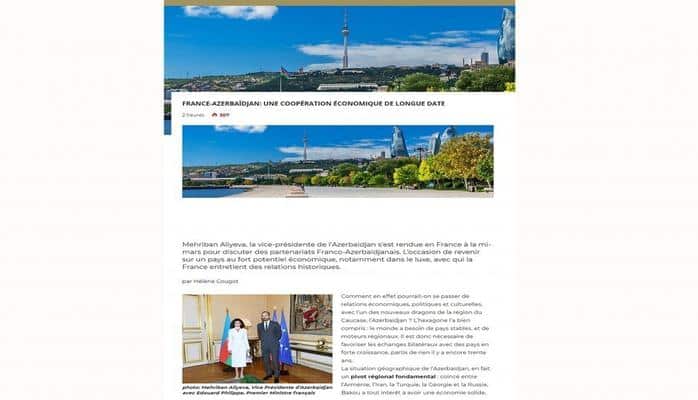 Fransanın https://luxus-plus.com portalında Azərbaycanın Birinci vitse-prezidenti Mehriban Əliyevanın bu ölkəyə səfəri ilə bağlı “Fransa-Azərbaycan: uzun tarixi, iqtisadi əməkdaşlıq” adlı məqalə dərc olunub.