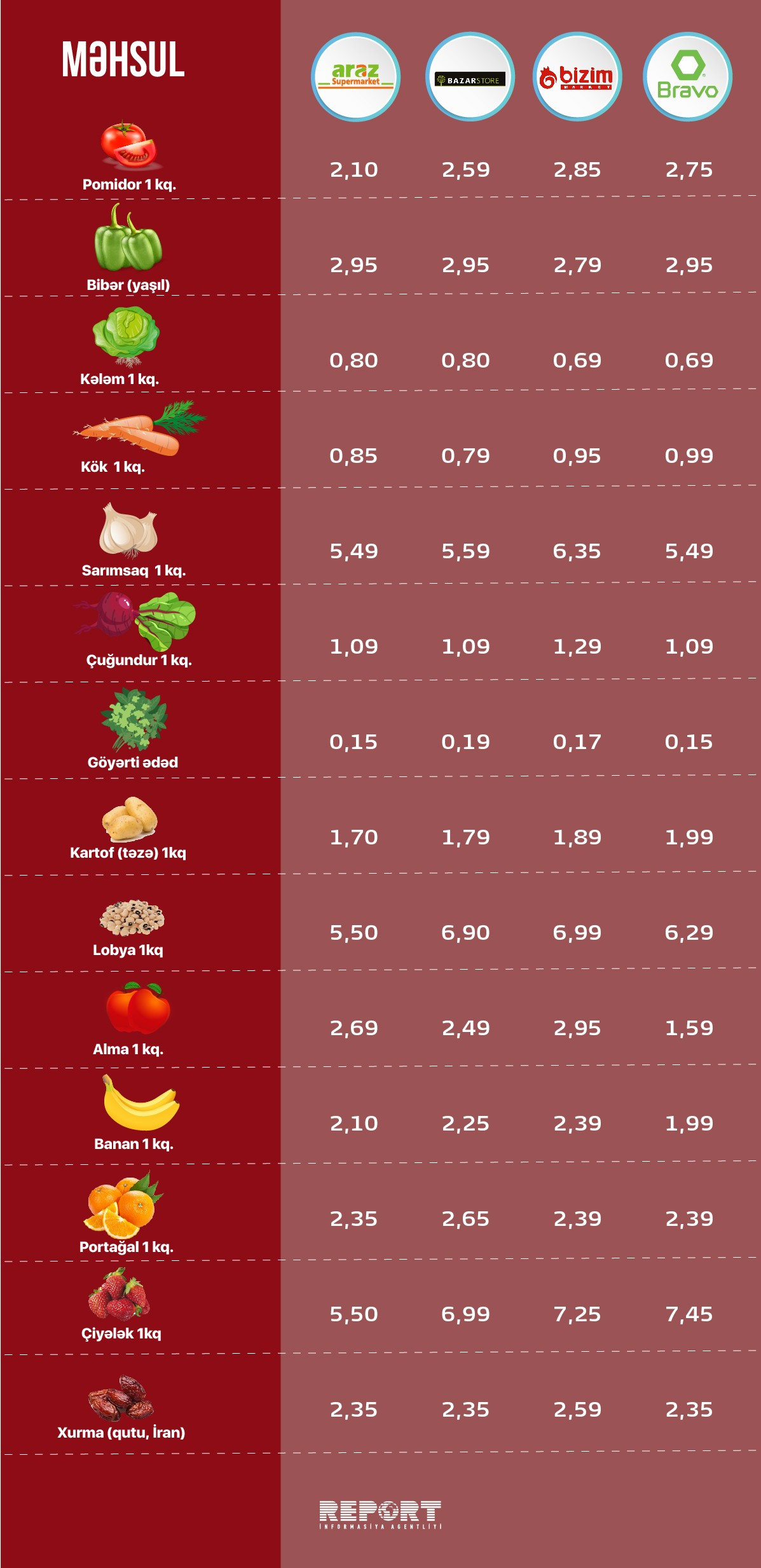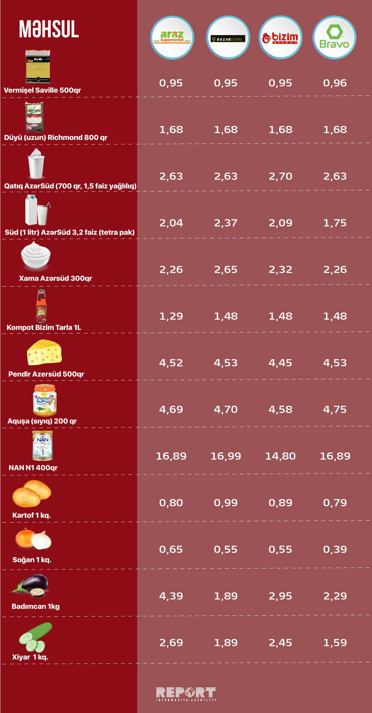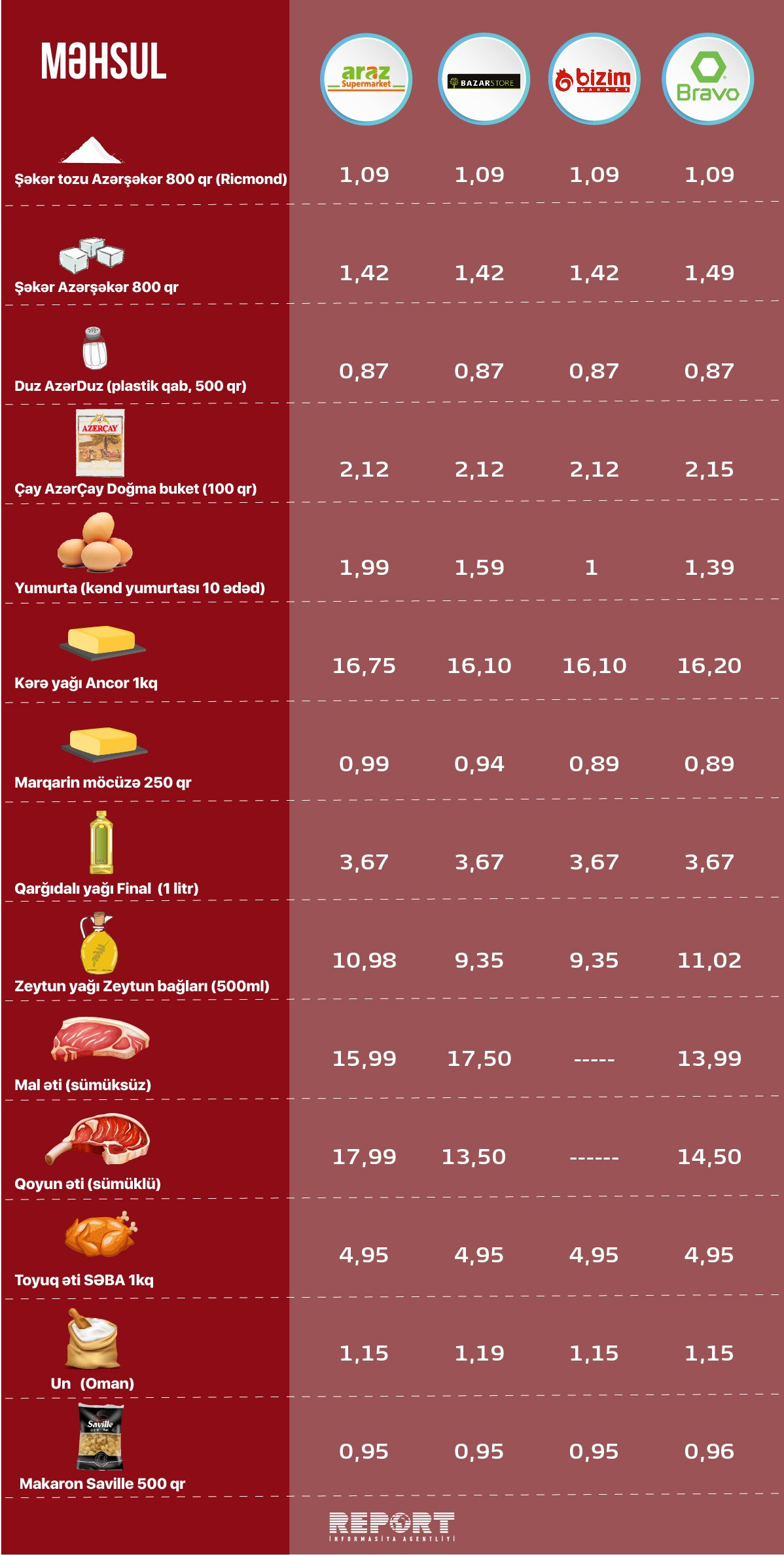 Ens.az Report.az-a istinadən xəbər verir ki, Azərbaycanda fəaliyyət göstərən iri mağaza şəbəkələrində 42 adda ərzaq məhsullarının qiymətlərini araşdırıb.