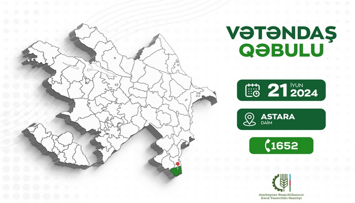 İyunun 21-də, saat 09:00-da kənd təsərrüfatı naziri Məcnun Məmmədov Astara Dövlət Aqrar İnkişaf Mərkəzinin inzibati binasında Astara, Lənkəran və Lerik rayonlarından olan vətəndaşları qəbul edəcək.