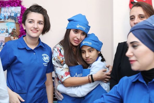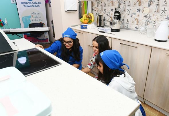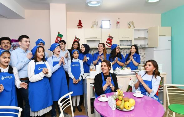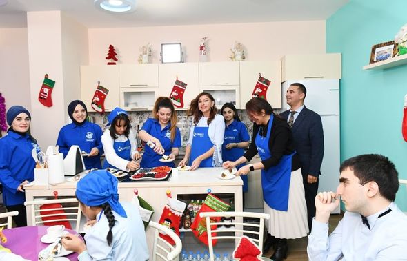 Sonra Mehriban xanım Əliyeva uşaqlarla birgə tort bişirdi, onlarla söhbət etdi.