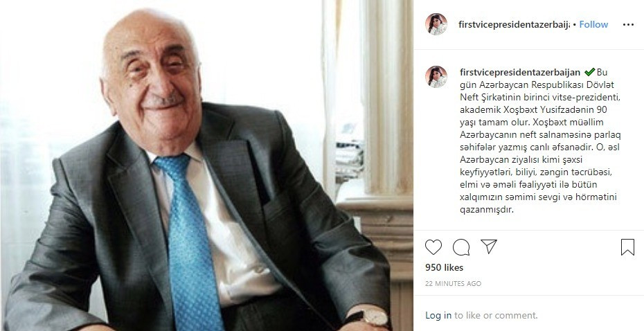 “Bu gün Azərbaycan Respublikası Dövlət Neft Şirkətinin birinci vitse-prezidenti, akademik Xoşbəxt Yusifzadənin 90 yaşı tamam olur. Xoşbəxt müəllim Azərbaycanın neft salnaməsinə parlaq səhifələr yazmış canlı əfsanədir. O, əsl Azərbaycan ziyalısı kimi şəxsi keyfiyyətləri, biliyi, zəngin təcrübəsi, elmi və əməli fəaliyyəti ilə bütün xalqımızın səmimi sevgi və hörmətini qazanmışdır.