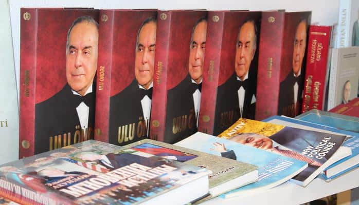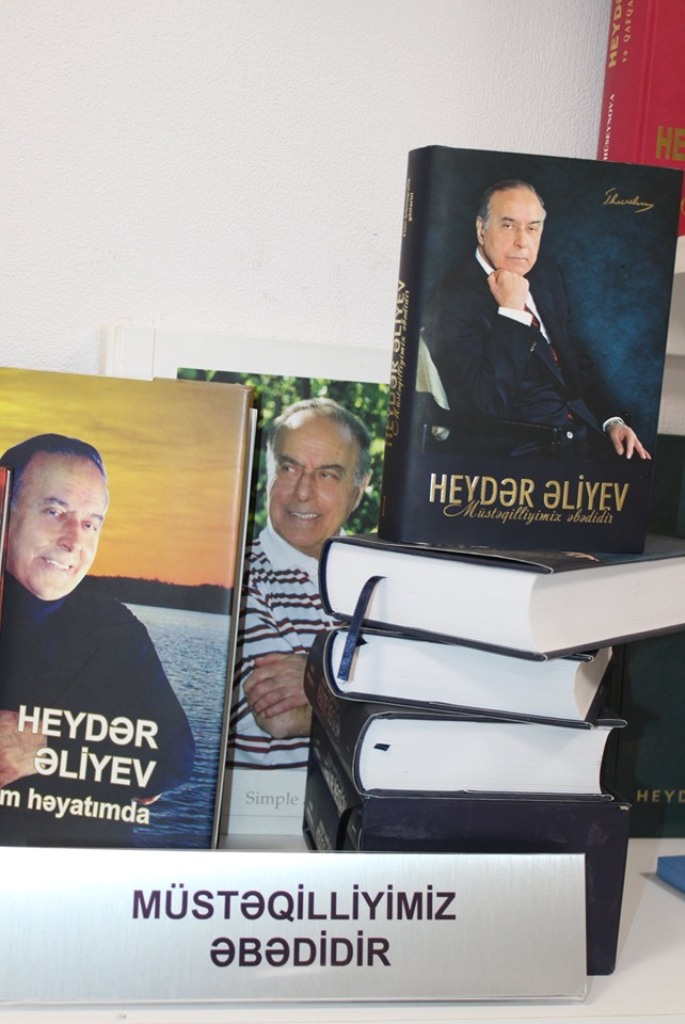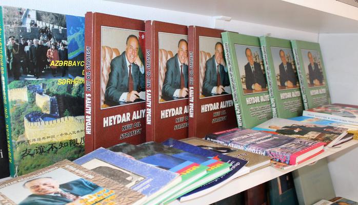 Sərgidə “Milli mənəvi dəyərimiz”, “Üstün zəka”, “Heydər Əliyev və Azərbaycanda milli siyasət” (Hidayət Orucov), “Azərbaycanda aqrar islahatlar” (Qərib Məmmədov), “Millətin atası” (Hüseynağa Mirələmov), “Xilaskar” (Eldar Elduası), “Böyük öndər” (Eldar İsmayıl), “Heydər Əliyev və kinematoqraf” (Aydın Kazımzadə), “Heydər Əliyevin dil siyasəti” (Vilayət Əliyev), “Heydər Əliyev və Azərbaycan dövlətçiliyində qadın məsələsi” (Məlahət Həsənova), “Müdrikliyin zirvəsi” (Balayar Sadiq), “Heydər Əliyev və Azərbaycanda kitabxana işi” (Abuzər Xələfov), “Bir taledə iki ömür. Xatirələr və düşüncələr” (Teymur Yəhyayev), “Гейдар Алиев и русская культура”, “Heydər Əliyev. Müstəqilliyimiz əbədidir” və digər kitablar nümayiş olunur.
