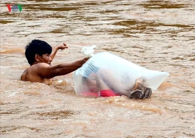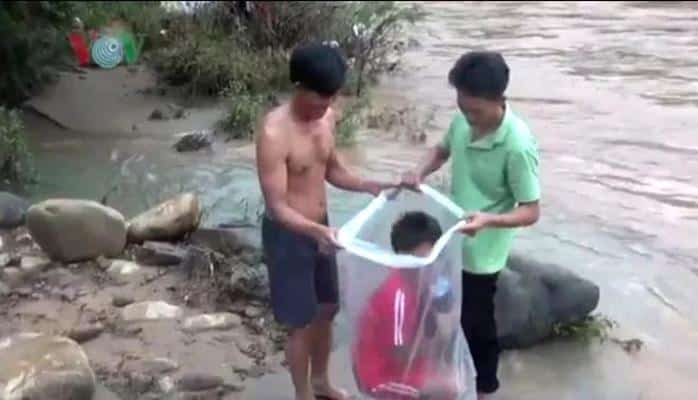 Yerli sakinlər isə uşaqlarını paketlərə qoyaraq çaydan keçirirlər.