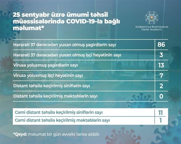 Məlumata görə, sentyabrın 23-də 86 şagirddə hərarət 37 dərəcədən yüksək olub.