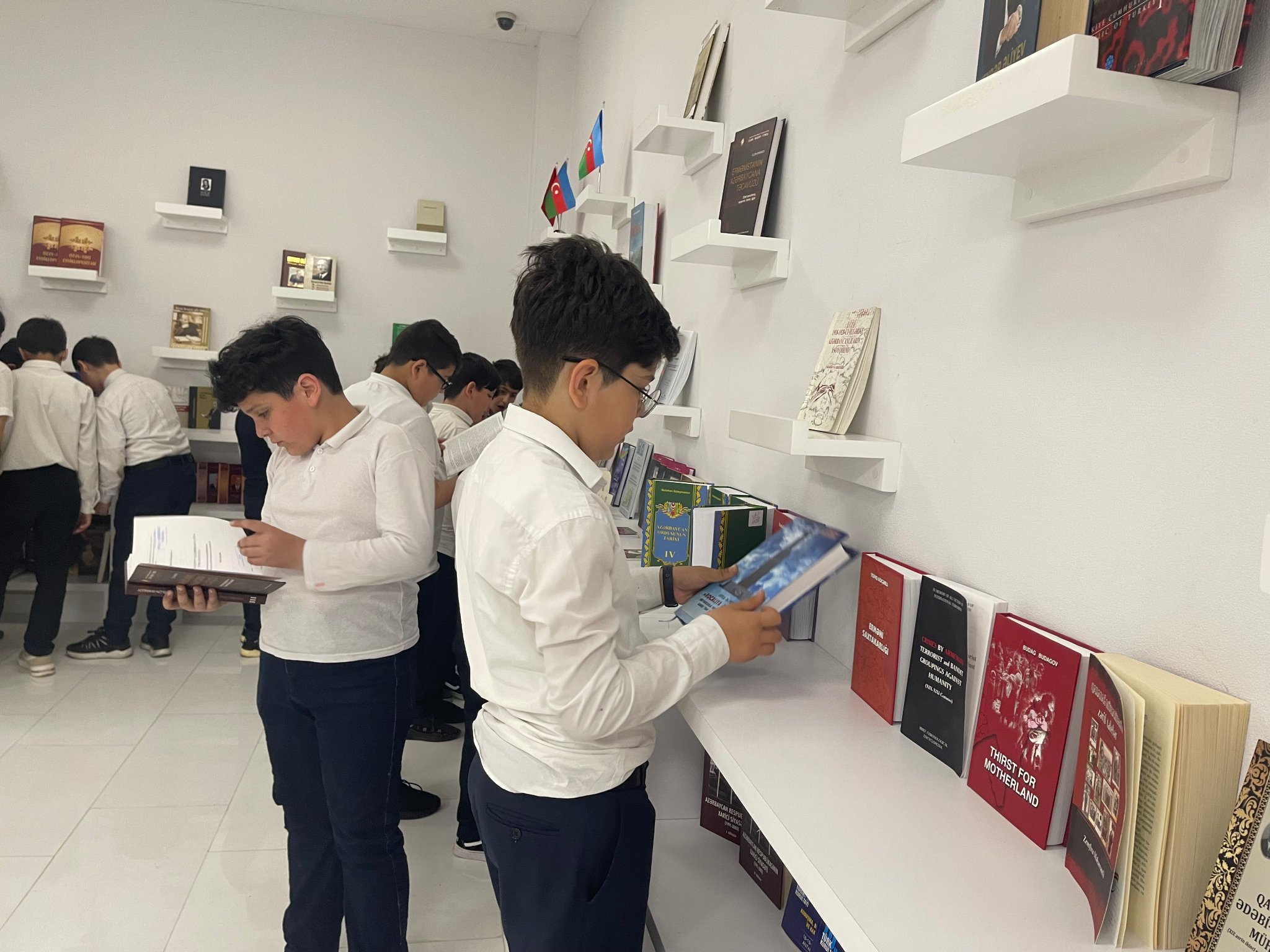 Məktəblilər Azərbaycan kitabxana sistemində ilk olan “Qarabağ müharibəsi qəhrəmanları” fondunda olarkən Ulu öndər Heydər Əliyevin, Prezident, Ali Baş Komandan İlham Əliyevin Qarabağ bölgəsində müxtəlif dövrlərdə çəkilmiş fotoşəkillərindən ibarət guşələrə baxıb, burada sərgilənən dəyərli nəşrlərə nəzər yetirib, həmçinin “Zəfər Memarları”, “Biz Qalib Xalqıq!”, “Qarabağ Azərbaycandır!” başlıqlı stendlərlə tanış olublar.