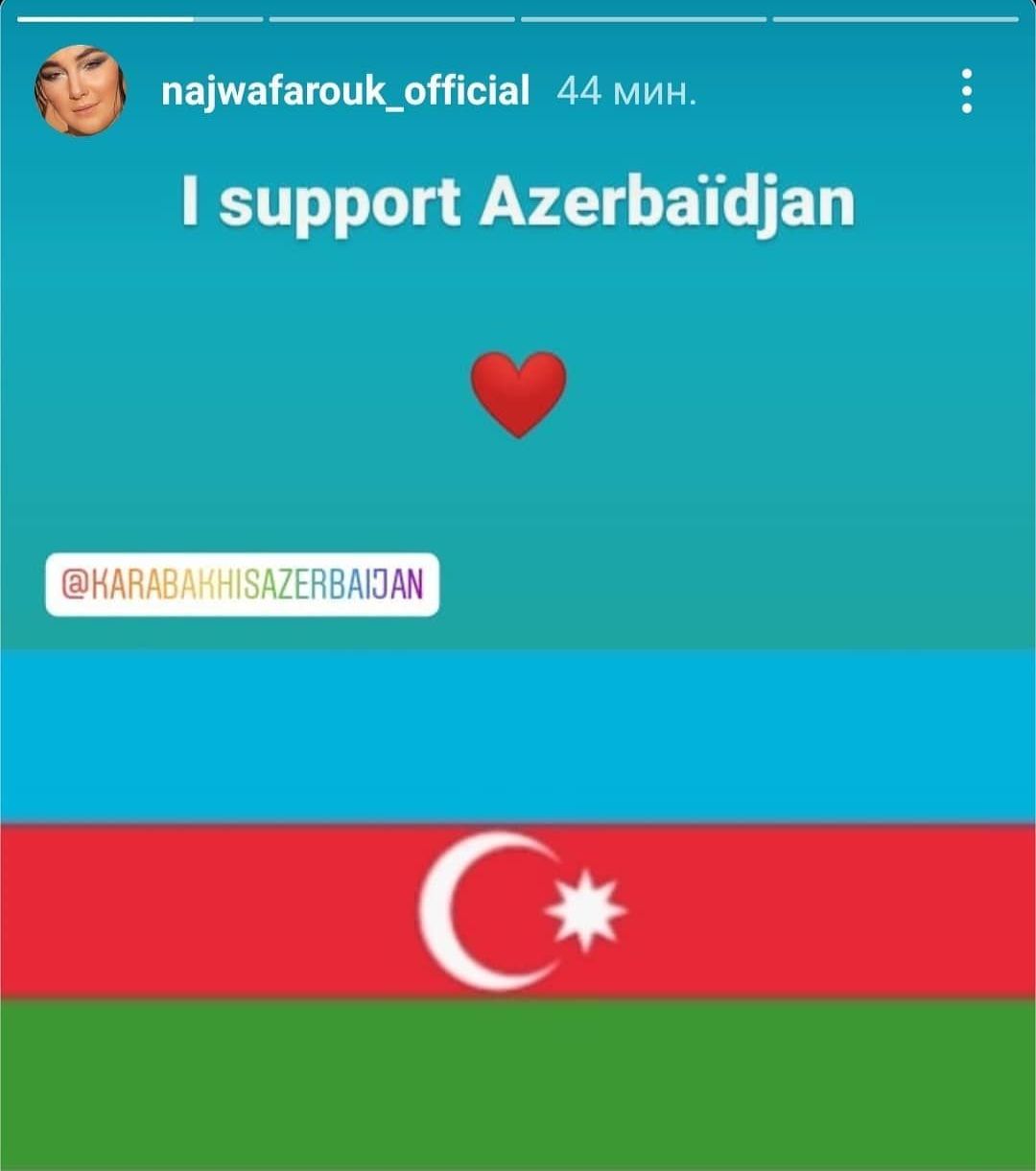 Ens.az Sputnik Azərbaycana istinadən bildirir ki, özünün Instagram səhifəsinin hekayə bölümündə müğənni Azərbaycan bayrağını yerləşdirib və azərbaycanlı dostlarını qeyd edib. Bu hərəkəti ilə müğənni Dağlıq Qarabağda əks-hücum əməliyyatı keçirərək əzəli torpaqlarını işğaldan azad edən Azərbaycan xalqına dəstəyini ifadə edib.