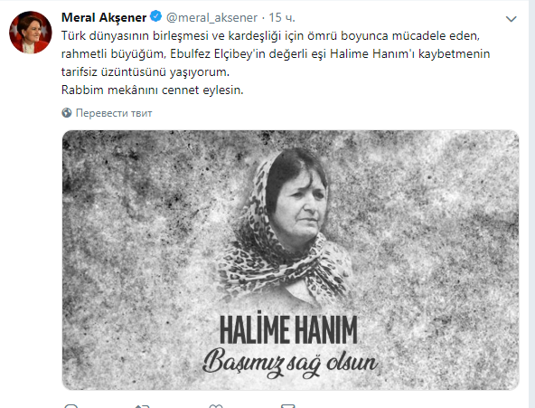 Türkiyəli siyasətçi, İYİ Partiyasının sədri Meral Akşener Azərbaycanın eks-prezidenti Əbülfəz Əliyevin (Elçibəy) xanımı Həlimə Əliyevanın vəfatından yazıb.