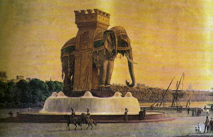 Bastiliya dağıdılandan sonra Napoleon bu yerdə abidə ucaltmaq qərarına gəlir və müsabiqə elan edir. Təqdim olunan layihələrin içindən o, ən qeyri-adi variantı seçir – fil şəklində abidə-fəvvarə. Tunc filin hündürlüyü 24 metr olmalı idi və suyun boşaldılması üçün işğal zamanı ispanlardan əldə olunan toplardan istifadə edilməli idi. Amma nədənsə, filin yalnız ağacdan olan modeli tikildi və 1813-cü ildən 1846-cı ilədək Parisdə, Bastiliyanın yerində qaldı.