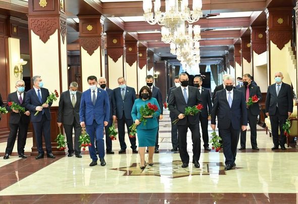 Milli Məclisin sədri Sahibə Qafarova, sədrin birinci müavini Əli Hüseynli, sədr müavinləri Adil Əliyev, Fəzail İbrahimli parlamentin komitə sədrləri, parlament Aparatının rəhbəri Səfa Mirzəyev və digər rəsmi şəxslər Milli Məclisin foyesində Heydər Əliyevin abidəsi önünə əkil qoyub, tər çiçəklər düzüblər.