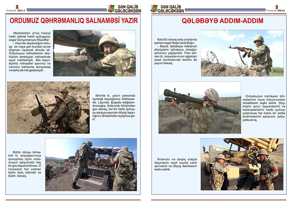 Bu günlərdə Müdafiə Nazirliyinin Hərbi Nəşriyyatının, Azərbaycan Ordusunun Sənədli və Tədris Filmləri Mərkəzinin, “Azərbaycan Ordusu” qəzeti redaksiyasının əməkdaşları döyüş bölgəsinə ezam edilib. Cəbhəboyu zonada quraşdırılan səyyar mətbəələrdə “Sən qalib gələcəksən!”, “Qalibiyyət döyüşü” və “Böyük Qələbə uğrunda” təşviqat vərəqələri, “Azərbaycan Ordusu” qəzetinin xüsusi buraxılışları, bukletlər hazırlanır cəbhədə olan şəxsi heyət və cəbhəboyu zonada yerləşən yaşayış məntəqələrinin sakinləri arasında yayılır.