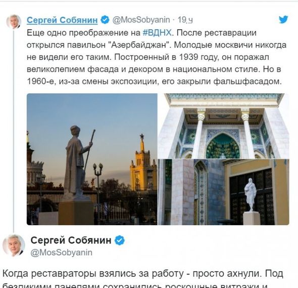 Rusiya paytaxtının meri Sergey Sobyanin özünün “Twitter” səhifəsində Moskvadakı Xalq Təsərrüfatı Nailiyyətləri Sərgisində “Azərbaycan” pavilyonun açılışından yazıb.