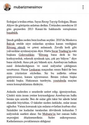 Bir neçə gün əvvəl Türkiyədə həbs edilən Palmali Şirkətlər Qrupunun prezidenti, Azərbaycanlı məşhur iş adamı Mübariz Mənsimov Qurbanoğlu həbsxanadan olduqca sensasion müraciət ünvanlayıb. Müraciət müəllifi məktubunda özünə qarşı ittihamları rədd edir, "SOCAR" rəhbəri Rövnəq Abdullayevə ağır ittihamlar yağdırıb.